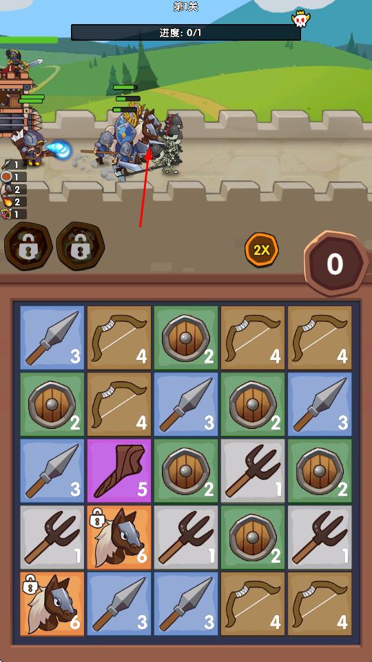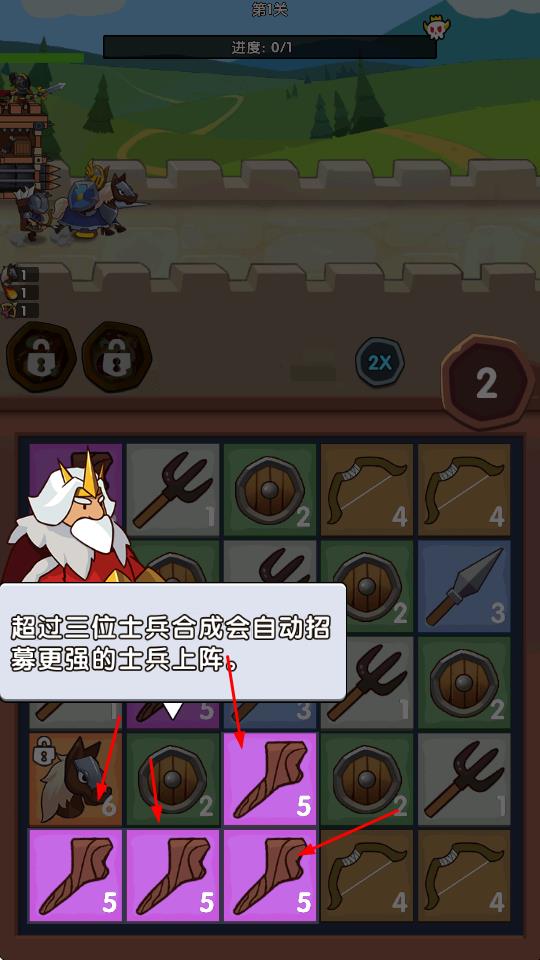 2、合成后,士兵自动沿路径进攻敌人,守护城堡,推进关卡进度(0/1)。