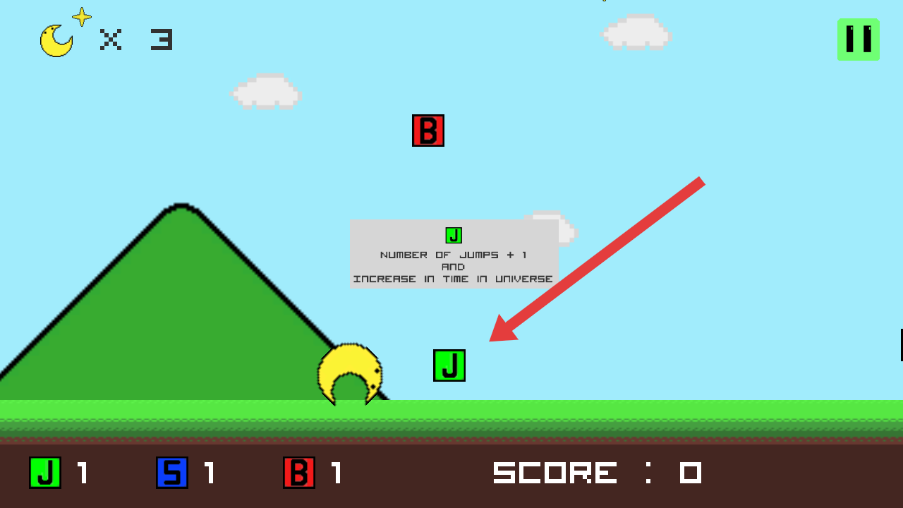 2、在月牙跳跃游戏中,需要操控黄色月牙角色,收集绿色【J】标识道具,可增加跳跃次数与游戏时间。