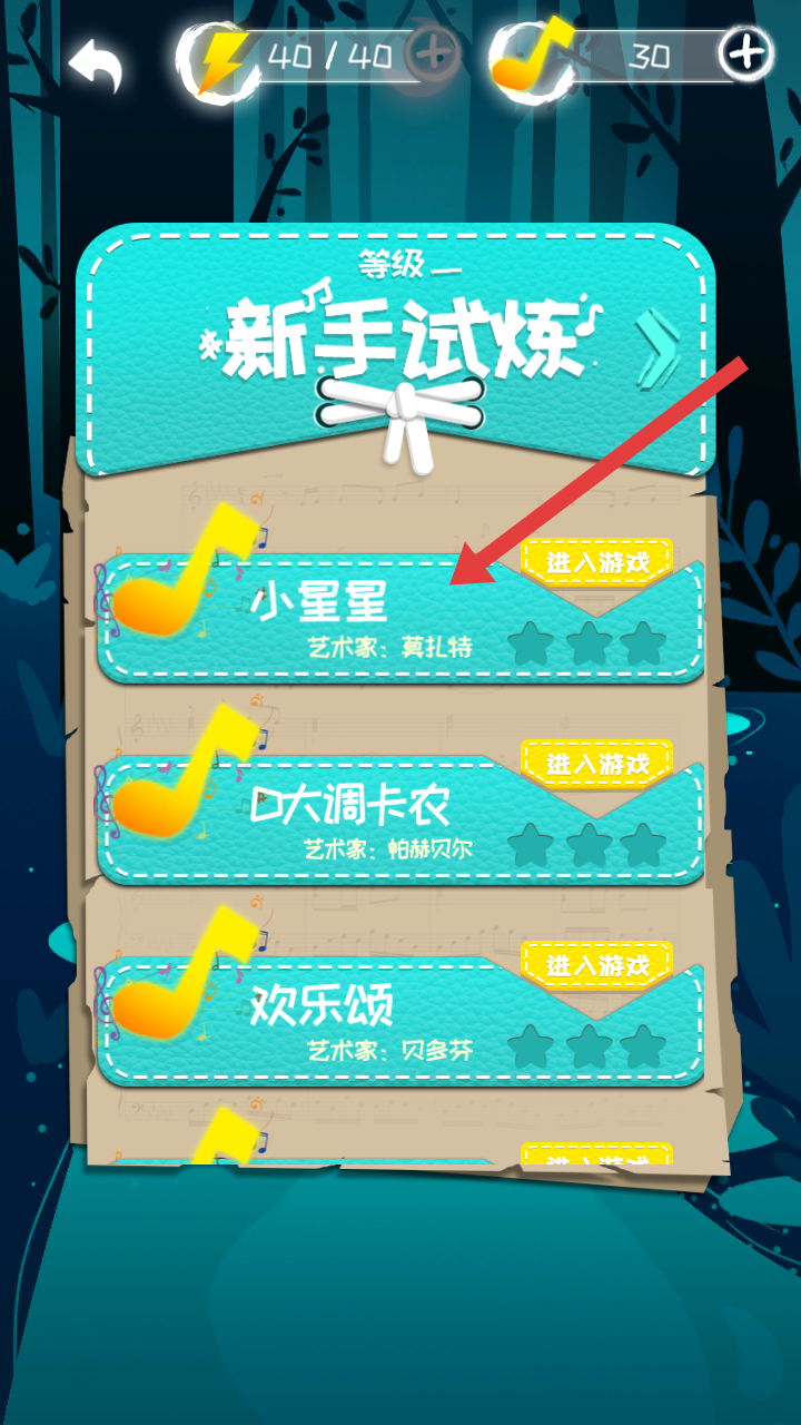 2、在关卡的选择页,挑选如【小星星(艺术家莫扎特)】等曲目,点击右侧进入游戏,开启对应音乐挑战。