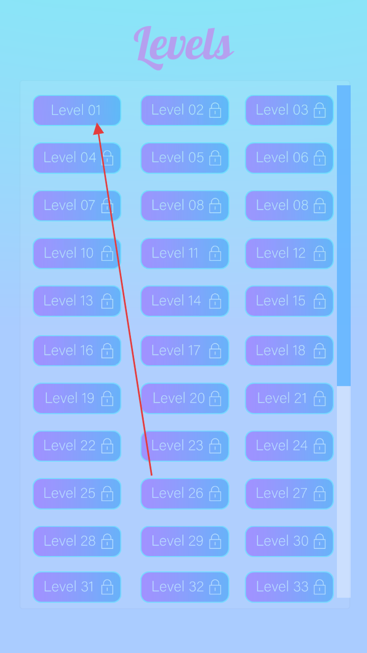 1、进入关卡选择界面,点击“Level01”等解锁关卡,开启挑战,推进游戏进程。