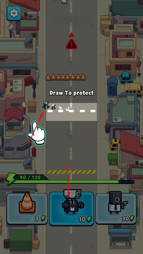 1、在Level1,拖动下方单位(交通锥、打手等)到道路,布置防线,阻挡马桶人进攻。