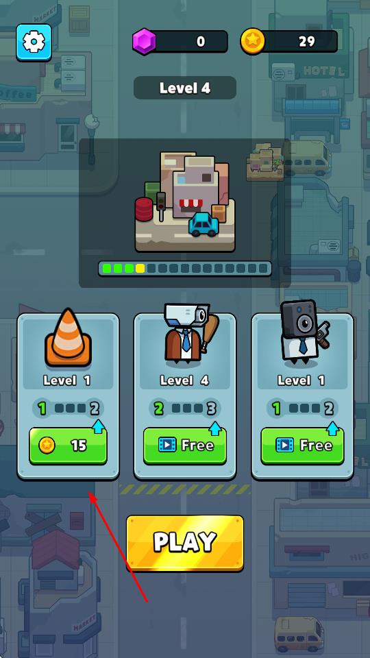 3、通关后,用金币/看广告升级单位(Level1→2),提升战力,点击“PLAY”挑战Level4。