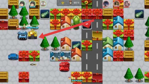 3、战斗中,操控坦克(如箭头指向的己方坦克),利用地形、道具,攻击敌方坦克,推进战局,赢取奖励。