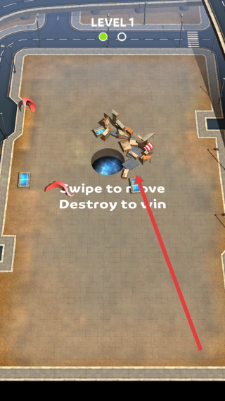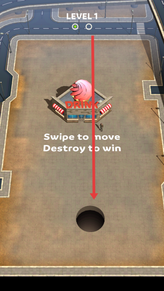 1、滑动屏幕,操控黑洞移动(箭头方向),吞噬“DRING”建筑,遵循“Swipe-to-move,Destroy-to-win”规则,壮大黑洞。