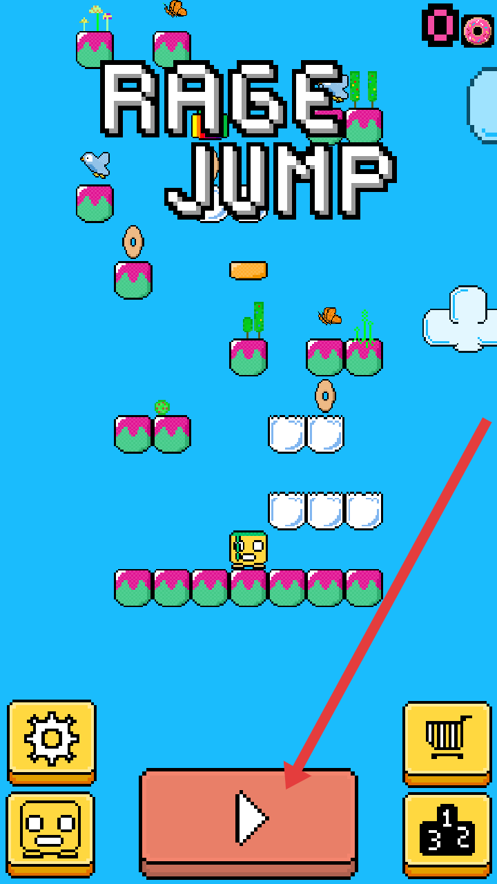 1、在愤怒跳跃游戏的主界面,点击粉色三角形【开始】按钮,进入愤怒跳跃的像素冒险世界。