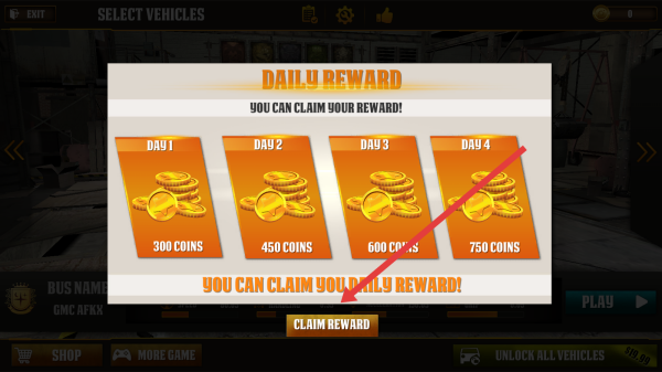 1、点击【CLAIM-REWARD】,领取每日奖励(如Day1的300金币),积累货币,用于解锁车辆、升级。