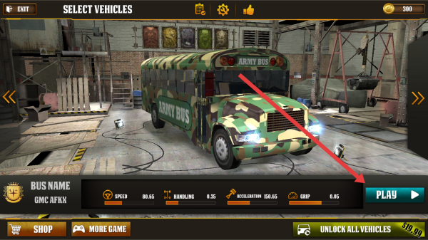 2、在车辆选择页,选中“ARMY-BUS”,查看速度(80.65)等属性,点击【PLAY】,进入驾驶任务。