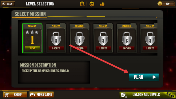 3、选择“MISSION-1”关卡,阅读任务描述(接送士兵等),点击【PLAY】,开始巴士驾驶挑战,完成任务。