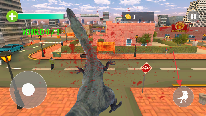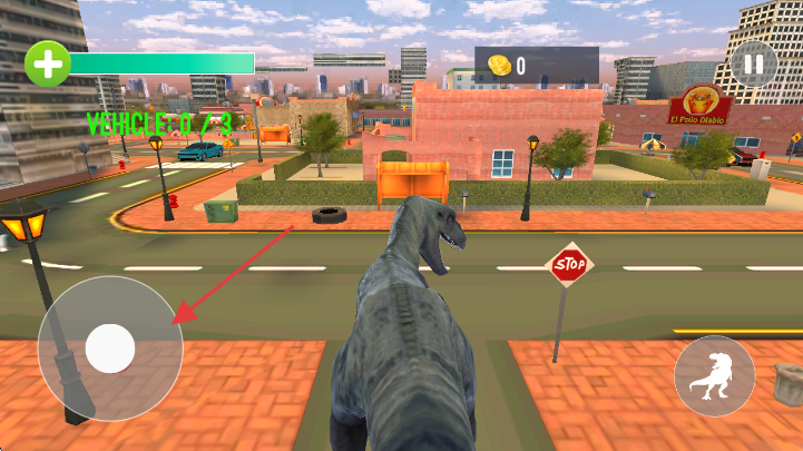 2、进入游戏后,通过左侧圆形操控按钮,控制恐龙在城市街道移动,探索场景。