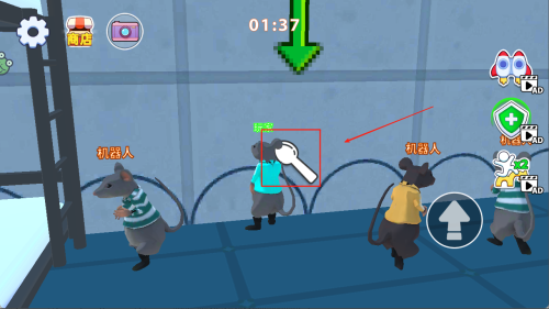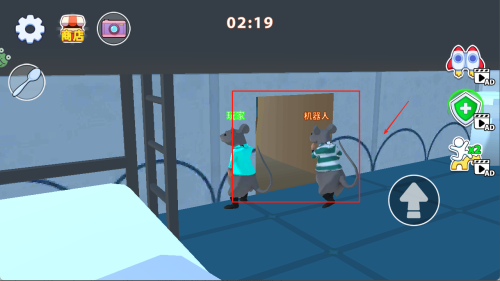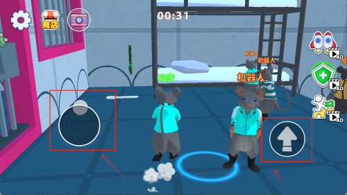 1、在场景中,通过左侧圆形虚拟摇杆【控制移动】,右侧箭头按钮【调整方向】,与队友“探索”“机器人”协作,躲避追捕。