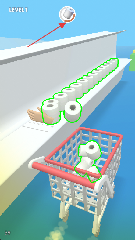 2、游戏中操控购物车,按箭头指引收集卫生纸卷,留意上方图标提示,确保收集顺利。