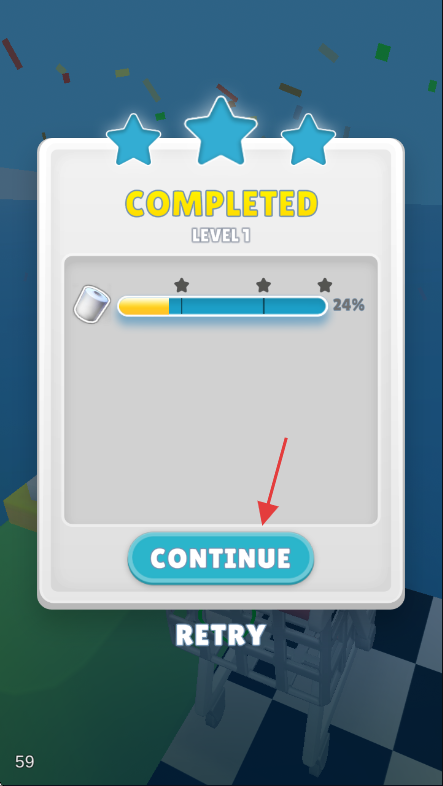 3、完成【LEVEL1】后,点击【CONTINUE】按钮,延续游戏进程,开启新挑战。