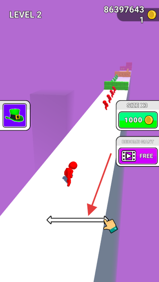 1、基础跑酷操作:滑动屏幕控制火柴人左右移动、上滑跳跃、下滑滑行,躲避前方障碍并收集颜料块。