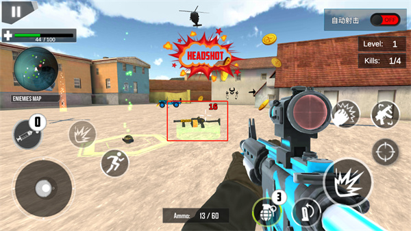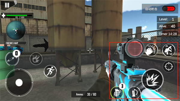 1、FPS基础操作:左手滑动屏幕调整视角,右手点击射击,配合跳跃、下蹲躲避攻击,长按屏幕屏息稳定准星,实现精准射击。