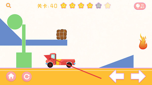 1、面对简单平地关卡,学习通过绘制直线引导卡车行驶,将火药安全送达火堆。