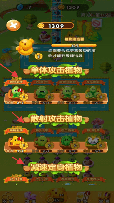 1、在植物界面,消耗金币合成高等级植物(单体、散射、减速类),提升建造器等级。