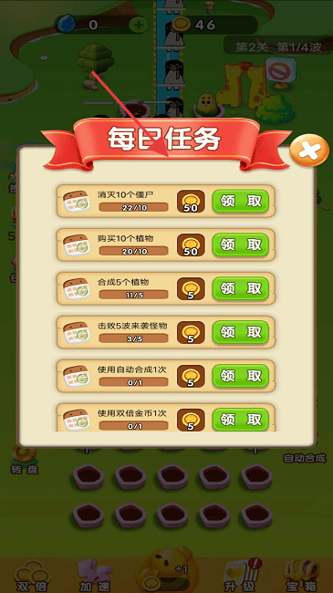 2、完成“每日任务”(消灭僵尸、购买植物等),领取金币、道具奖励,强化植物。