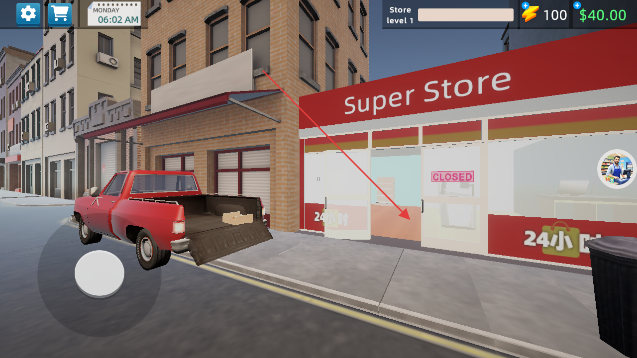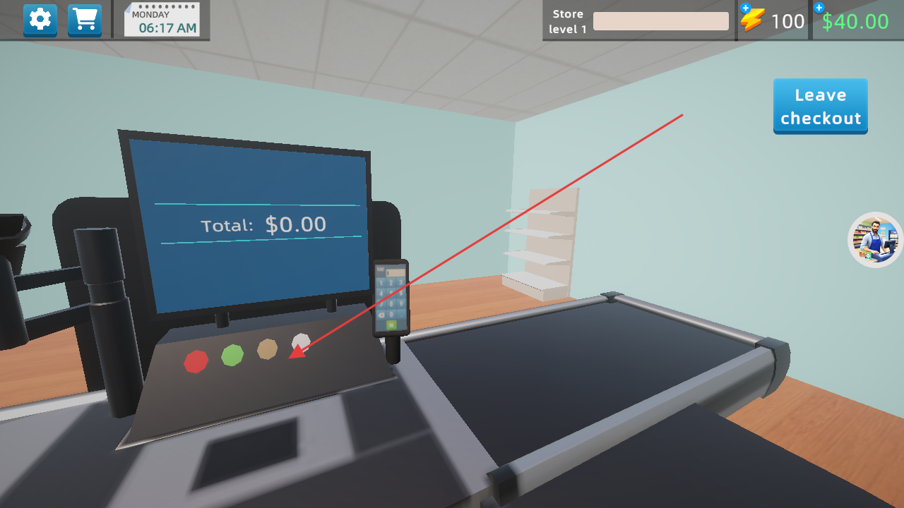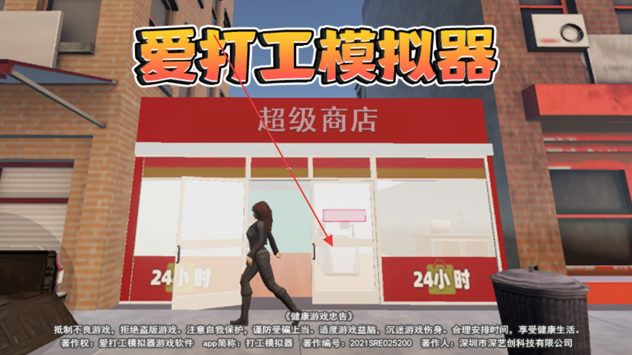 2、在商店外等待开门,进入后操作收银台等设备,完成购物、收银等打工流程。