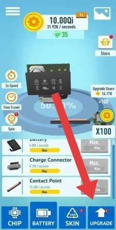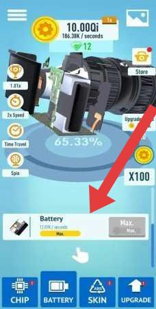 1、在相机升级页,点击箭头指向的电池升级区域,消耗金币提升电池性能(如从1.179K→更高),增强设备续航。