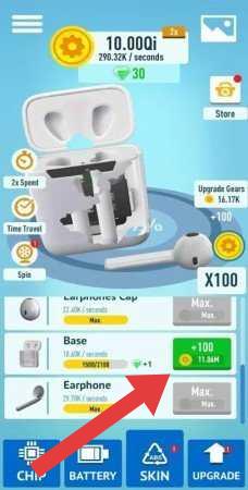 3、进入耳机升级页,点击“Base”旁的【+100】按钮,花费金币升级底座,提升耳机整体性能(如功率、稳定性),推进设备养成。