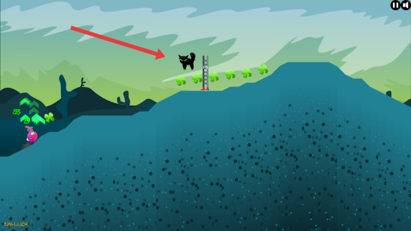 2、游戏中,引导兔子避开箭头指向的黑猫,跳跃过山坡上的绿色三叶草,保持奔跑节奏,推进关卡。