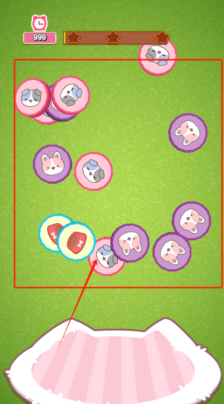 1、消除配对挑战:限定时间内找出相同图案的猫爪印,连续配对触发连锁反应获额外时间,通过消除关卡推进游戏进度。