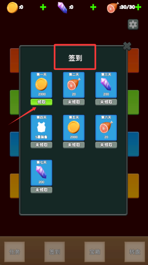2、点击第一天奖励,立即领取2000金币。
