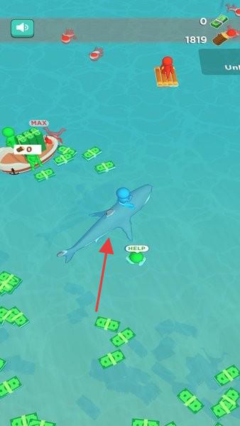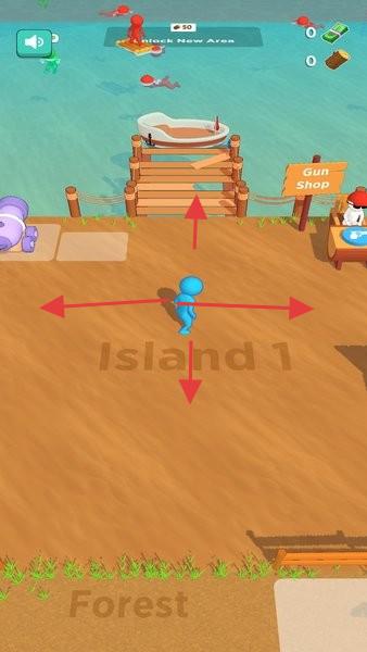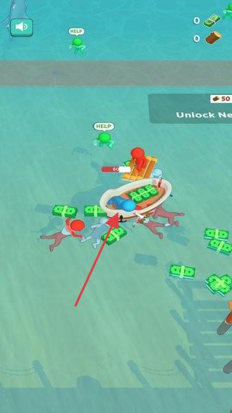 1、在Island1操控蓝色小人移动,前往海边,进入水中解救船上被围攻的角色,拾取周围钞票。