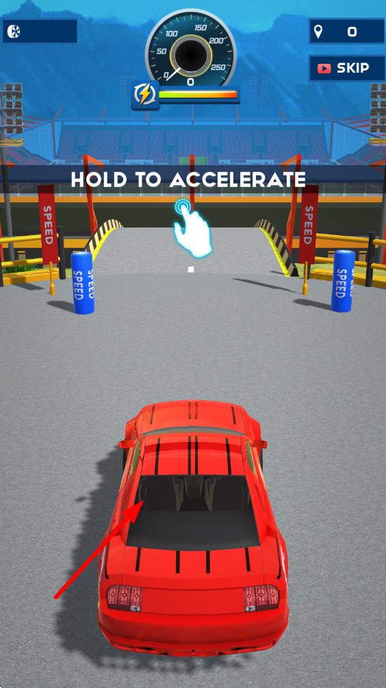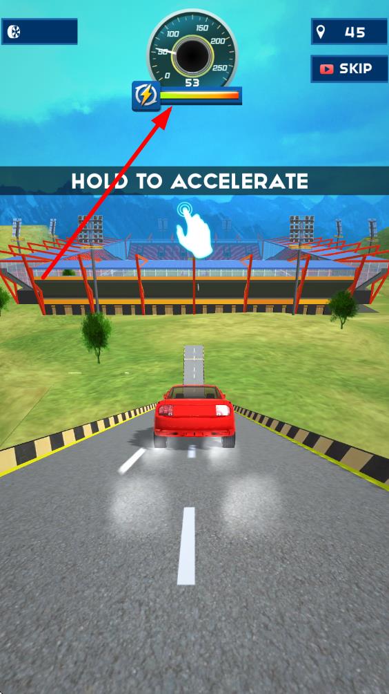 2、踏上赛道后,紧盯任务提示,通过倾斜屏幕或点击按钮控制赛车,在斜坡处精准加速,完成空翻、漂移等指定特技。