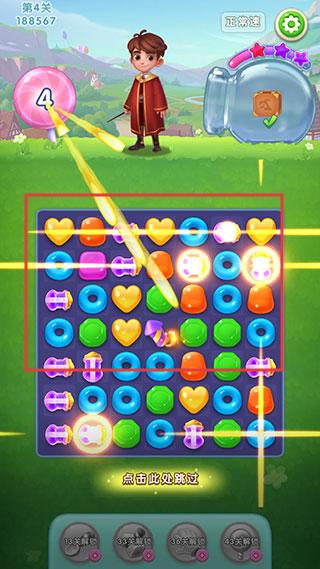 2、障碍应对策略:面对彩虹糖时优先消除包裹层,遇到贪吃怪兽需集中连击累积眩晕值,魔法漩涡出现后快速消除以激活糖果增生效果。