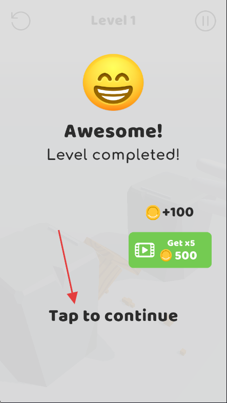 3、关卡完成出现【Awesome! Level completed!】后,点击【Tap to continue】进入后续游戏内容。