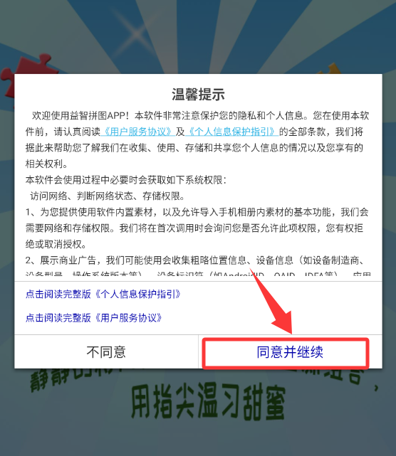 1、打开游戏点击红色框框的同意并继续。