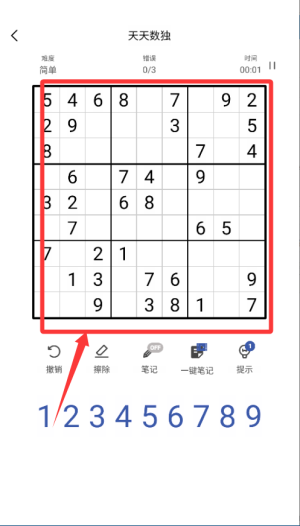 1、开始挑战前先观察已给出的数字分布,找出每行、每列和宫格中缺失的部分,从最容易填的位置入手更省时间。