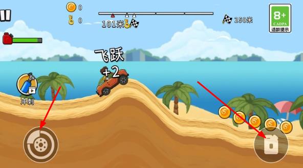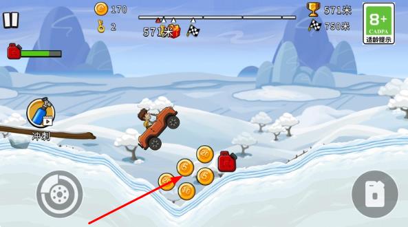 3、在比赛过程中滑动屏幕控制方向,点击加速键提升车速,长按漂移键过弯并收集沿途金币。