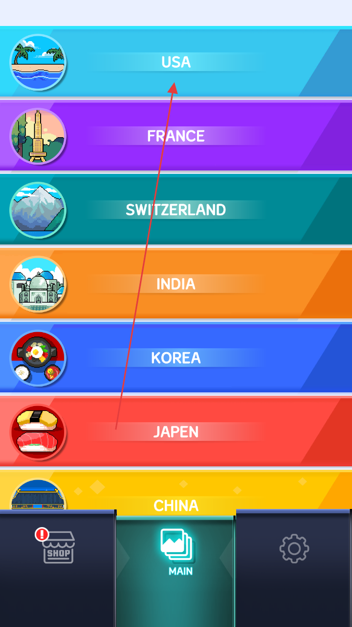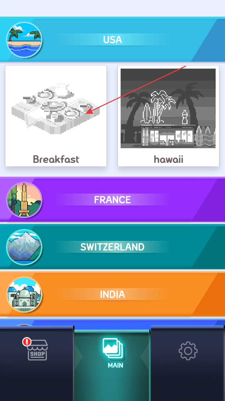 1、进入游戏界面,选择国家(如USA、FRANCE 等),解锁对应国家主题的像素画(如USA下的Breakfast、hawaii)。
