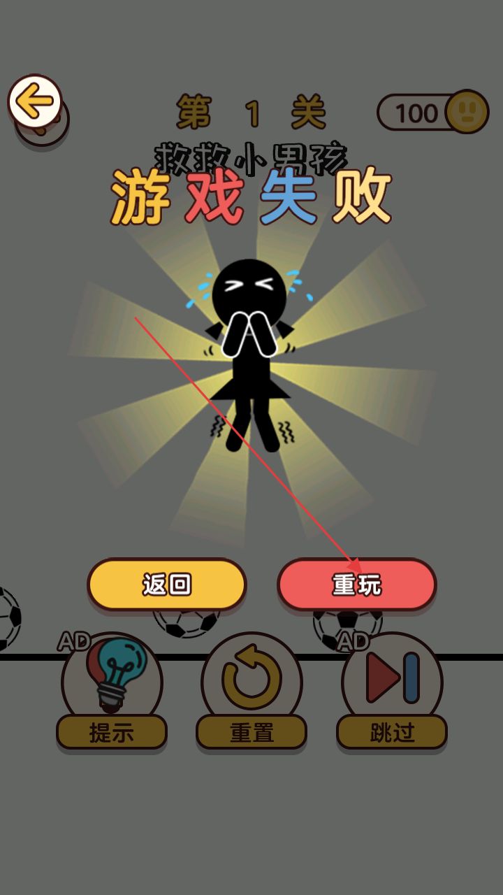3、若游戏失败,点击“重玩”按钮,重新挑战关卡,调整策略,完成“救救小男孩”等目标,推进进度 。