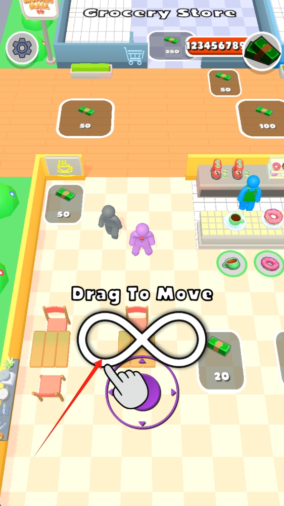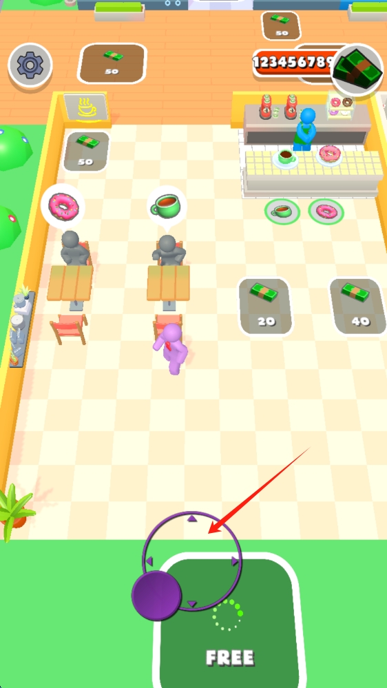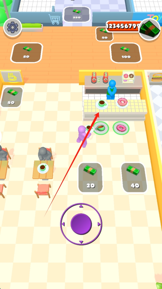 1、拖动紫色摇杆控制角色移动,在场景中收集散落钞票,留意咖啡店等区域的互动点。
