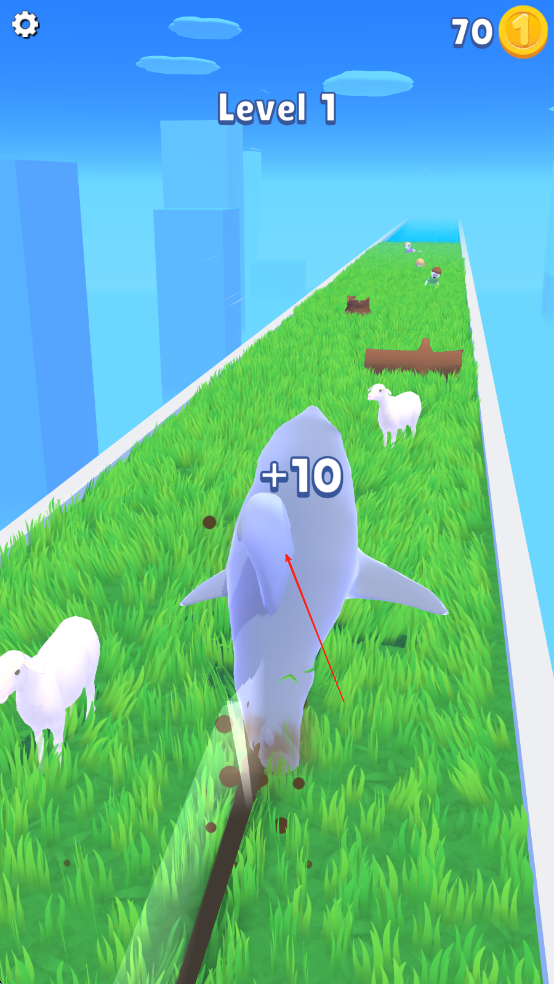 1、进入游戏后滑动屏幕控制鲨鱼移动,撞击穿红色衣服的行人获得高额积分,躲避穿蓝色衣服的警察,被击中会减少生命值。