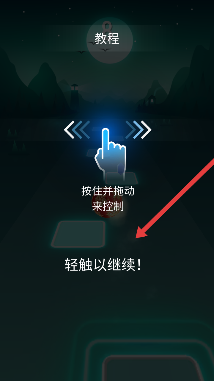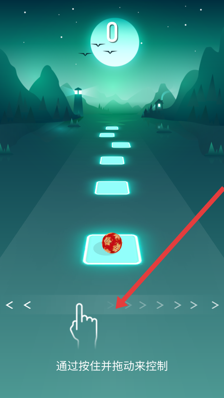 1、在Music Ball Ball游戏开始时,按照提示【按住并拖动】屏幕,掌握红球移动的操控方式,开启闯关。