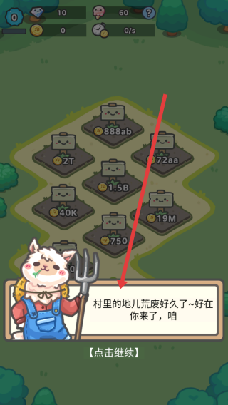 1、进入游戏,点击【点击继续】,触发羊驼对话,了解“村里荒地”背景,开启农场开垦玩法。