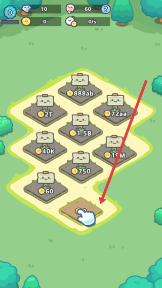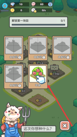 2、在农田界面,点击箭头指向的荒地,消耗资源开垦,完成“解锁第一块田”任务,扩展农场区域。