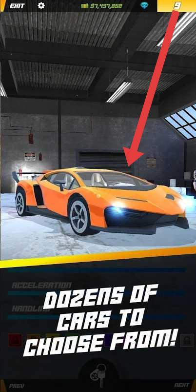 1、在车库界面,选橙色跑车,确认“DOZENS-OF-CARS-TO-CHOOSE-FROM!”,为关卡挑战配置赛车。