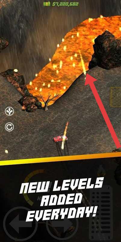 2、进入熔岩关卡,操控赛车,沿箭头方向,穿越火焰地形,利用“NEW-LEVELS-ADDED-EVERYDAY!”的新关卡,挑战极限。