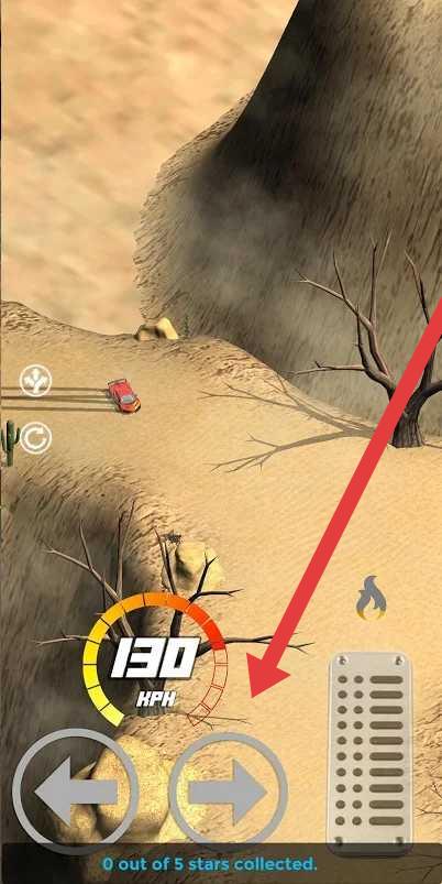 3、沙漠关卡中,按箭头指引,点击加速/转向按钮,控制130-KPH的赛车,收集星星,完成闯关目标。