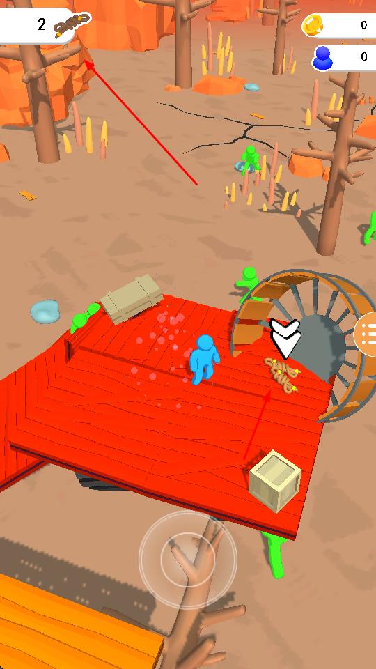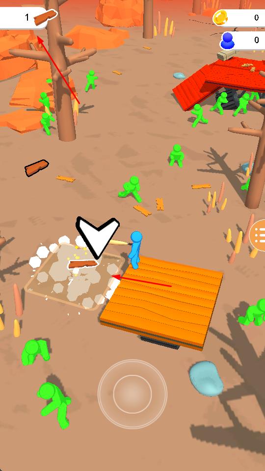 1、操控蓝色火柴人移动,沿箭头指引收集物资(木材、道具),避开绿色敌人。