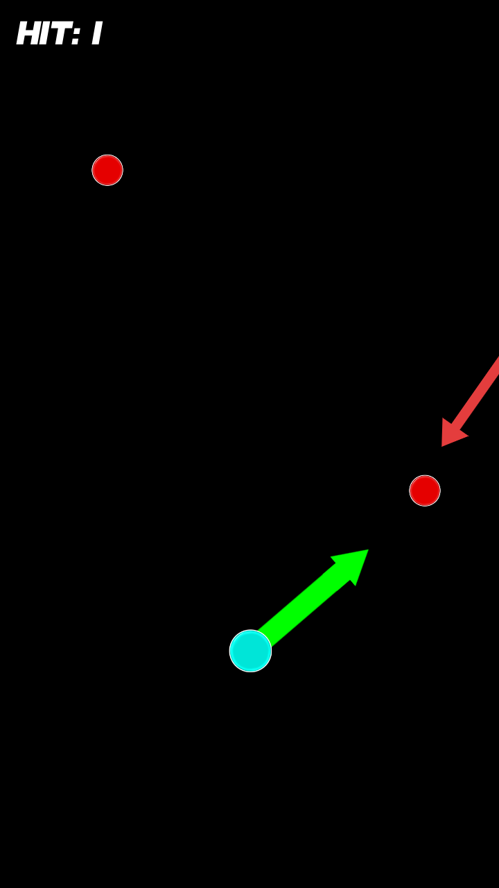 2、加载后进入游戏,观察蓝球初始位置与红球分布,滑动屏幕调整绿箭头方向(弹射轨迹),释放弹球使其弹跳撞击红球。