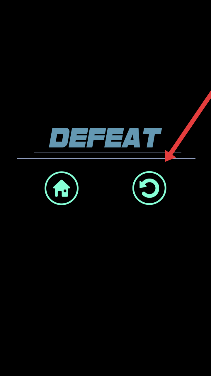 3、若挑战失败,界面显示“DEFEAT”,点击右侧带循环箭头的按钮,无需退出主界面,直接重新加载当前关卡,优化弹射策略再战。