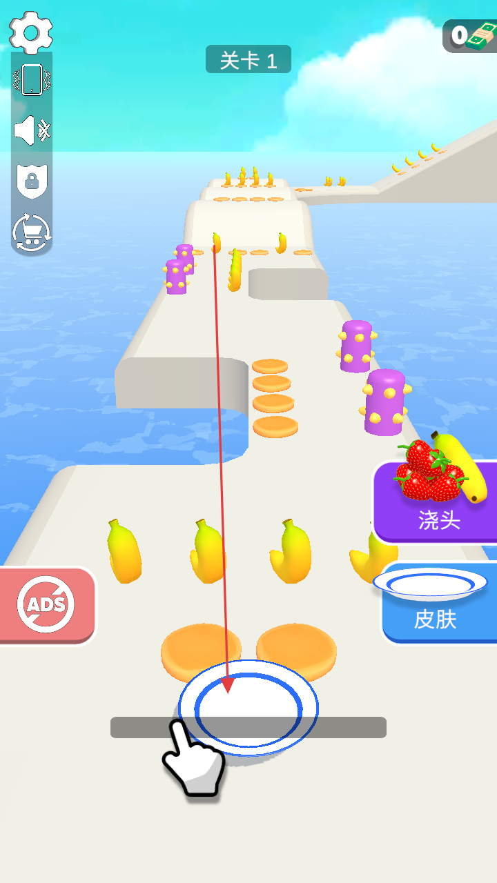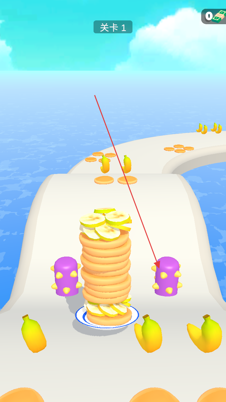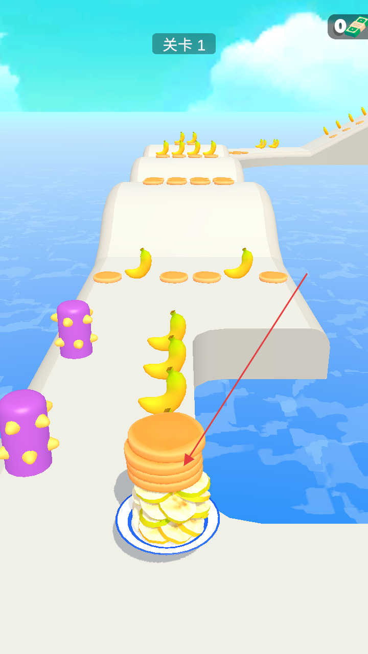 2、在道路上躲避紫色带刺障碍,通过跳跃或调整路径,让盘子顺利通过,持续堆叠煎饼与水果。