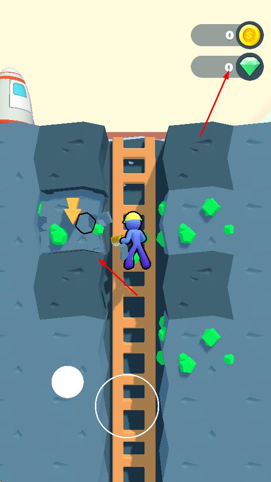 1、操控矿工沿轨道挖取绿色宝石,积累金币、钻石资源,注意躲避岩石障碍。
