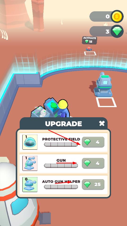2、返回基地,消耗钻石(4、25等)升级“PROTECTIVEFIELD”“GUN”等设施,增强防御与攻击。